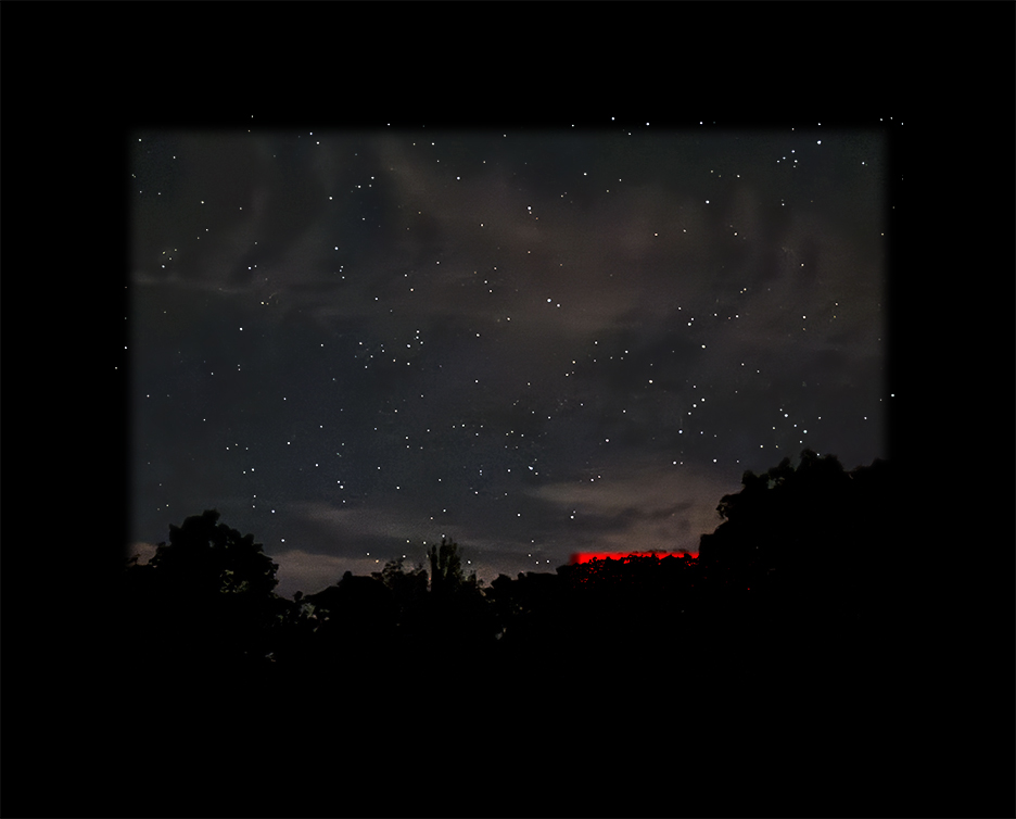 "Night Sky 18 Aug IMG_7886 Adjusted w Red" is a signed limited edition. Printed with Archival Inks on Epson Ultra Premium Luster Paper. Custom sizes and materials are available.